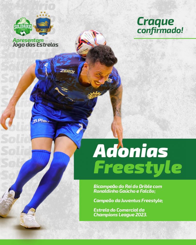 O Pato Futsal e o Solidário Esporte Clube promovem o Jogo das Estrelas no próximo 04 de dezembro, quinta-feira, a partir das 19h, na Arena Cláudio Petrycoski, em Pato Branco. O evento reunirá atletas e ex-atletas do futsal, do futebol, além do ícone do freestyle mundial Adonias. Quem também irá abrilhantar a festa é Manoel Tobias, um dos melhores atletas de todos os tempos do futsal mundial.