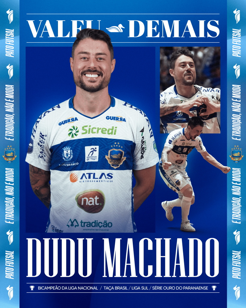 O fixo Eduardo Machado, mais conhecido como Dudu Machado, anunciou oficialmente a aposentadoria das quadras. Símbolo de raça e profissionalismo, Dudu Machado marcou história e deixou um legado vitorioso no cenário do futsal brasileiro e mundial. E a carreira terminou com o título da Série Ouro do Campeonato Paranaense defendendo o Pato Futsal.