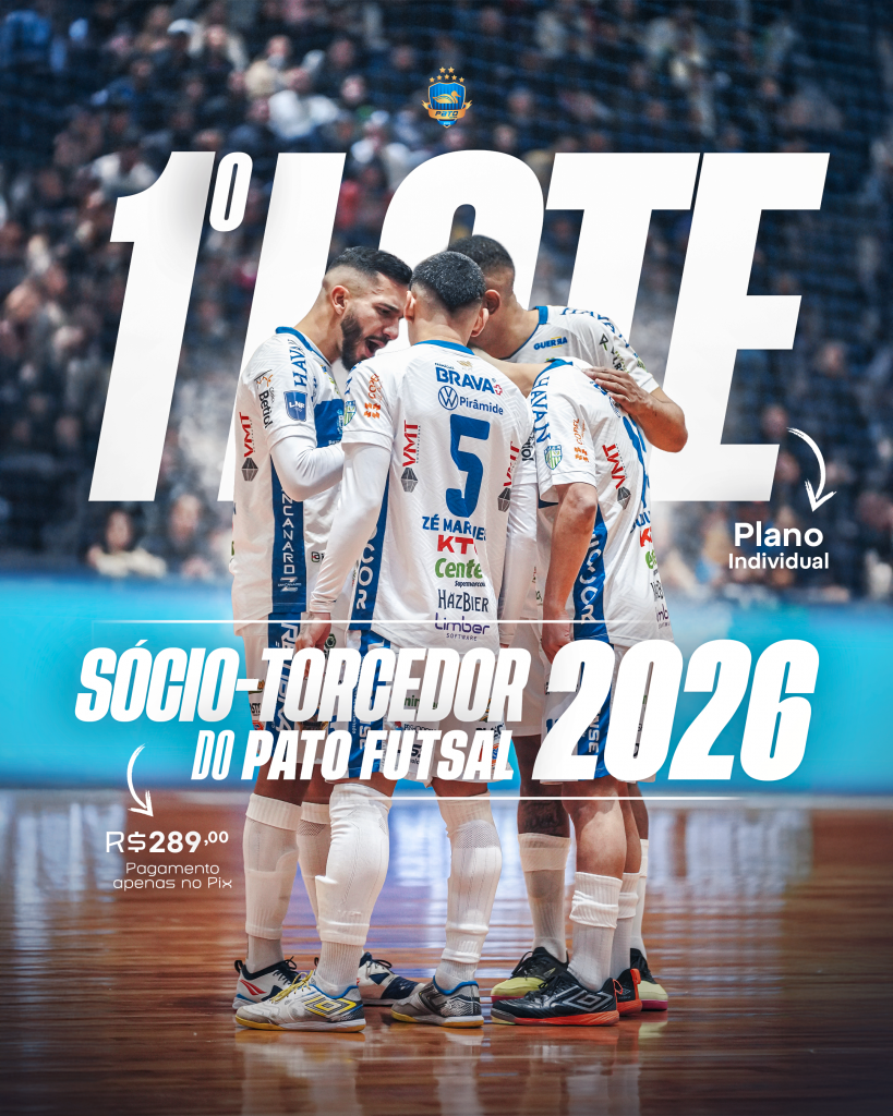 O Pato Futsal conta com uma das torcidas mais vibrantes do Brasil e do mundo. Nesta segunda-feira (06/10), a equipe pato-branquense lançou o novo plano de sócio-torcedor, que será válido por toda temporada 2026. O 1º lote é limitado para os mil primeiros torcedores, sendo R$ 289,00 por carteirinha e os pagamentos apenas via pix. As adesões podem ser feitas de forma online https://ingressos.patofutsal.com.br ou diretamente na Fato Store Artigos Esportivos, localizada no PB Shopping.